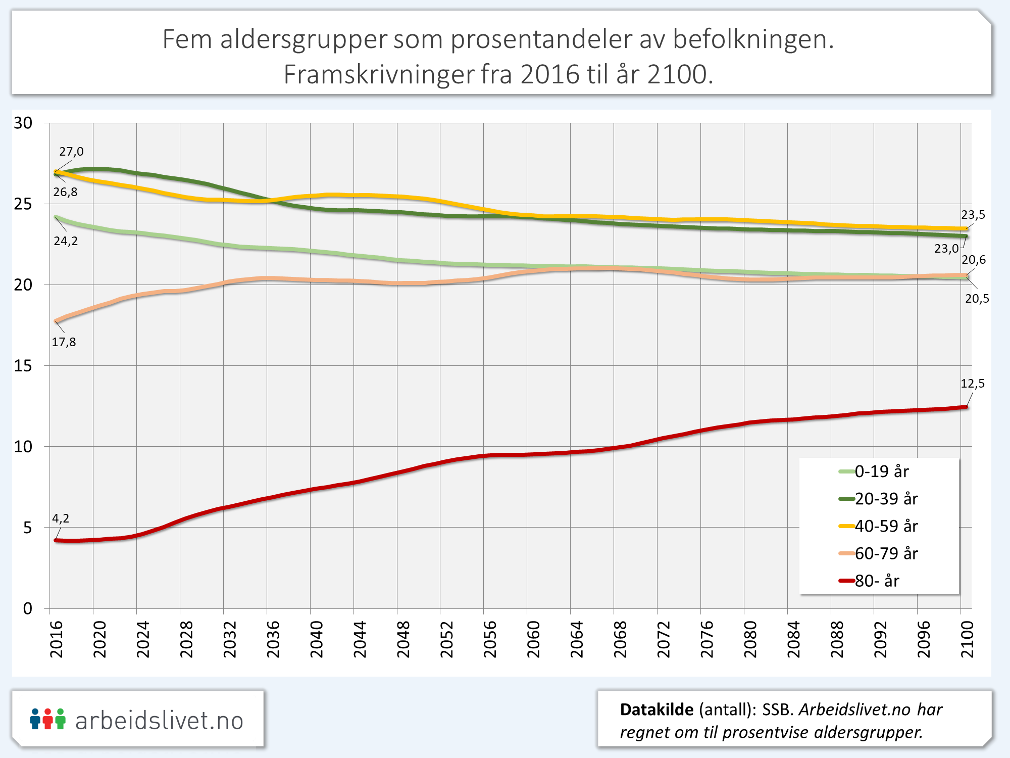 Ser man på andelen over 80 år blir da ikke utviklingen fullt så dramatisk. Likevel: Gruppen 80+ vil utgjøre en tre ganger så stor del av befolkningen som helhet, nærmere bestemt vokse fra 4,2 til 12,4 prosent. De to gruppene under som er 60 år eller eldre vil til sammen øke fra 22 prosent til 33 prosent, ifølge framskrivningen.