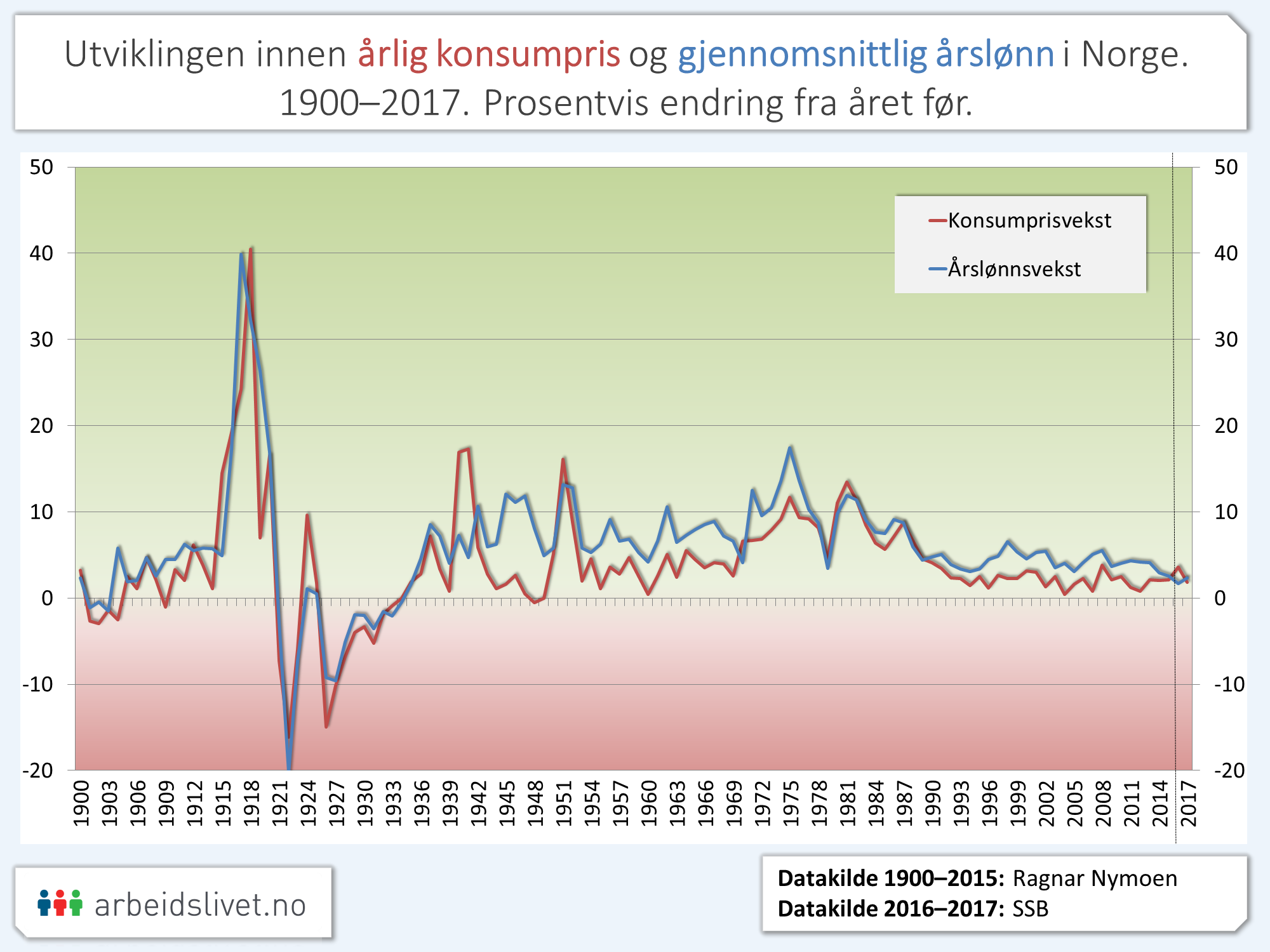 Alle tre figurer er for årene fram til og med 2015 basert på tall fra professor Ragnar Nymoen ved Senter for lønnsdannelse / Samfunnsøkonomisk analyse. For en grundigere gjennomgang av lønnsutviklingen, kan du blant annet lese hans artikkel: «Between Institutions and Global Forces: Norwegian Wage Formation Since Industrialisation» (PDF-format). For årene 2016 og 2017 har vi imidlertid måtte hente tilsvarende tall fra Statistisk Sentralbyrå, se henholdsvis temasidene Konsumprisindeksen og Lønn (her brukt: kpi-årsgjennomsnitt og månedslønn, gjennomsnitt alle næringer). |