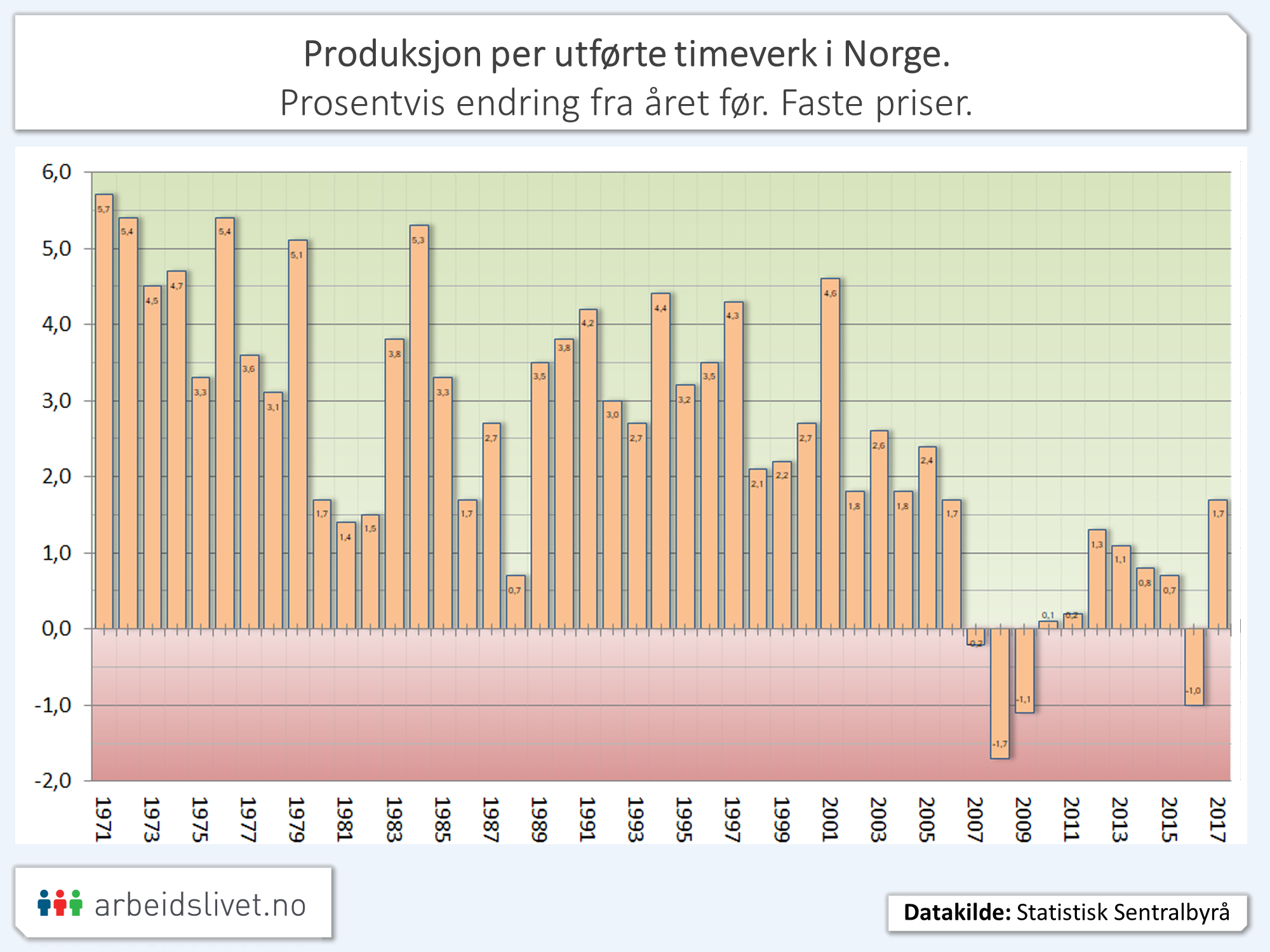 Som man ser, har denne veksten dabbet av i Norge målt mot særlig 70- og 90-tallet. Den økonomiske situasjonen har like fullt mye å si. De to «røde» periodene – da produktiviteten per arbeidstid faktisk ble lavere – var preget av økonomiske kriser, nærmere bestemt finanskrisa og oljekrisa.