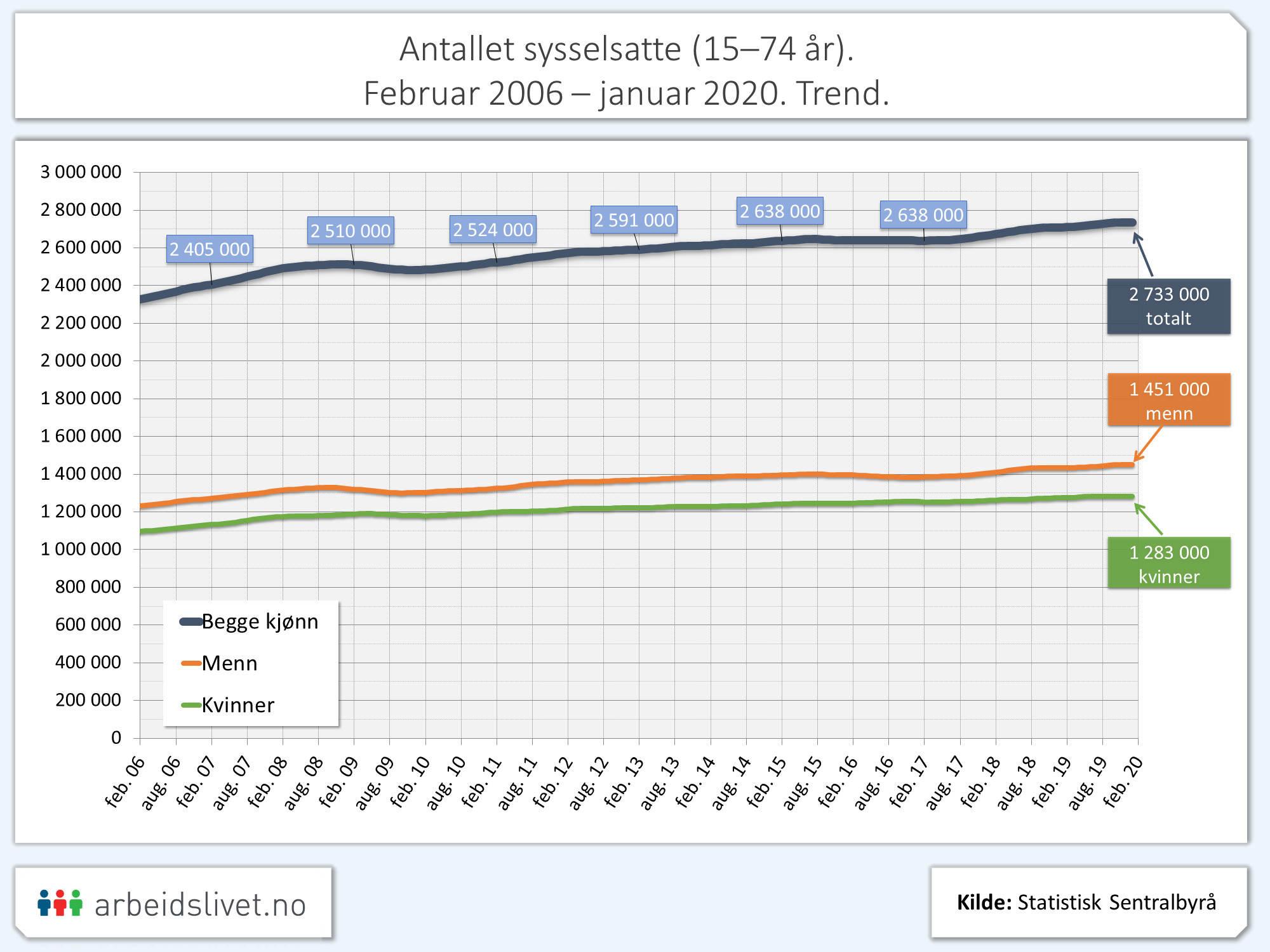 Fra 2006 fram til 2015 holdt arbeidsledigheten seg under 4 prosent av arbeidsstyrken, ifølge SSBs sesongjusterte AKU-tall. På nyåret 2008 var den helt nede i under 2,5 prosent.