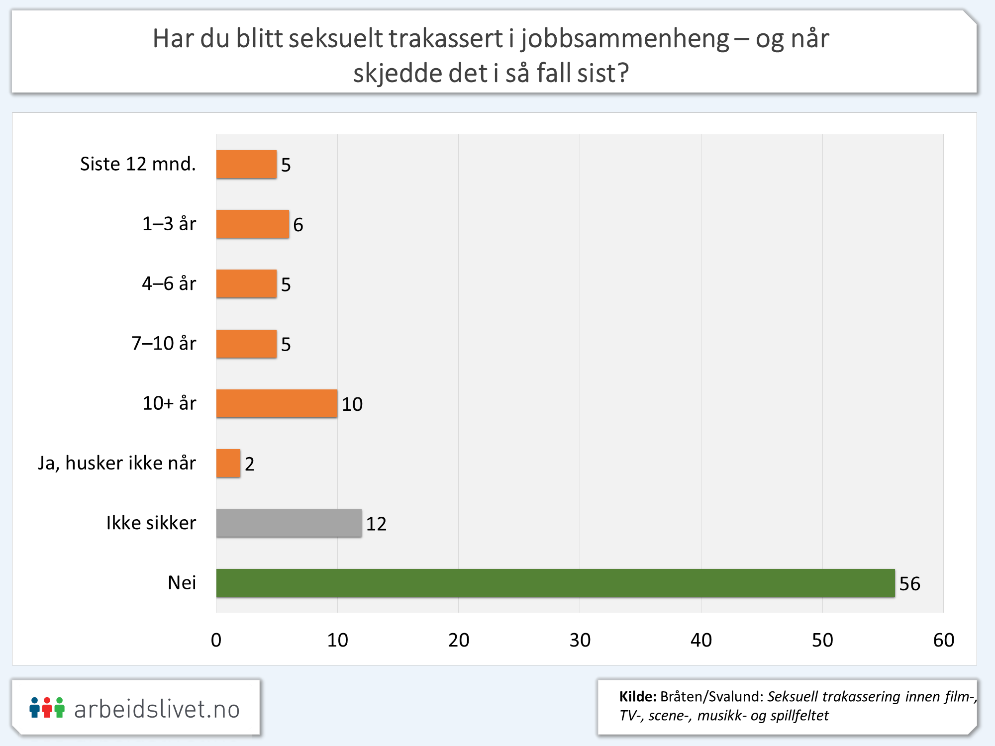 Fafo-forskere har undersøkt hvorvidt personer som jobber innen film, TV, scene, musikk og spill opplever seksuell trakassering i arbeidssituasjonen. Gruppen består både av utøvende og skapende kunstnere så vel som produsenter, teknikere og administrativt ansatte.