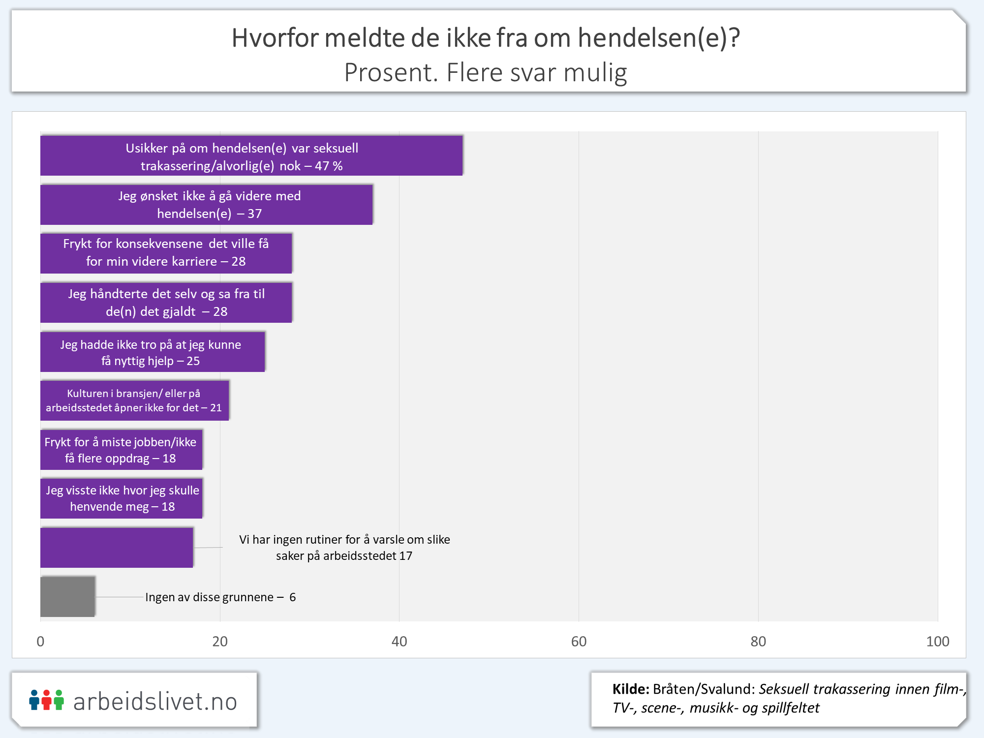 Alvoret skjerpes når man ser for eksempel at 28 prosent fryktet for karrieren eller at en fjerdedel mente det ikke var noe hjelp å få. Det mer vage alternativet «ønsket ikke å gå videre med hendelsen(e)», som 37 prosent krysset av på, kan også skjule mange problematiske forhold.
