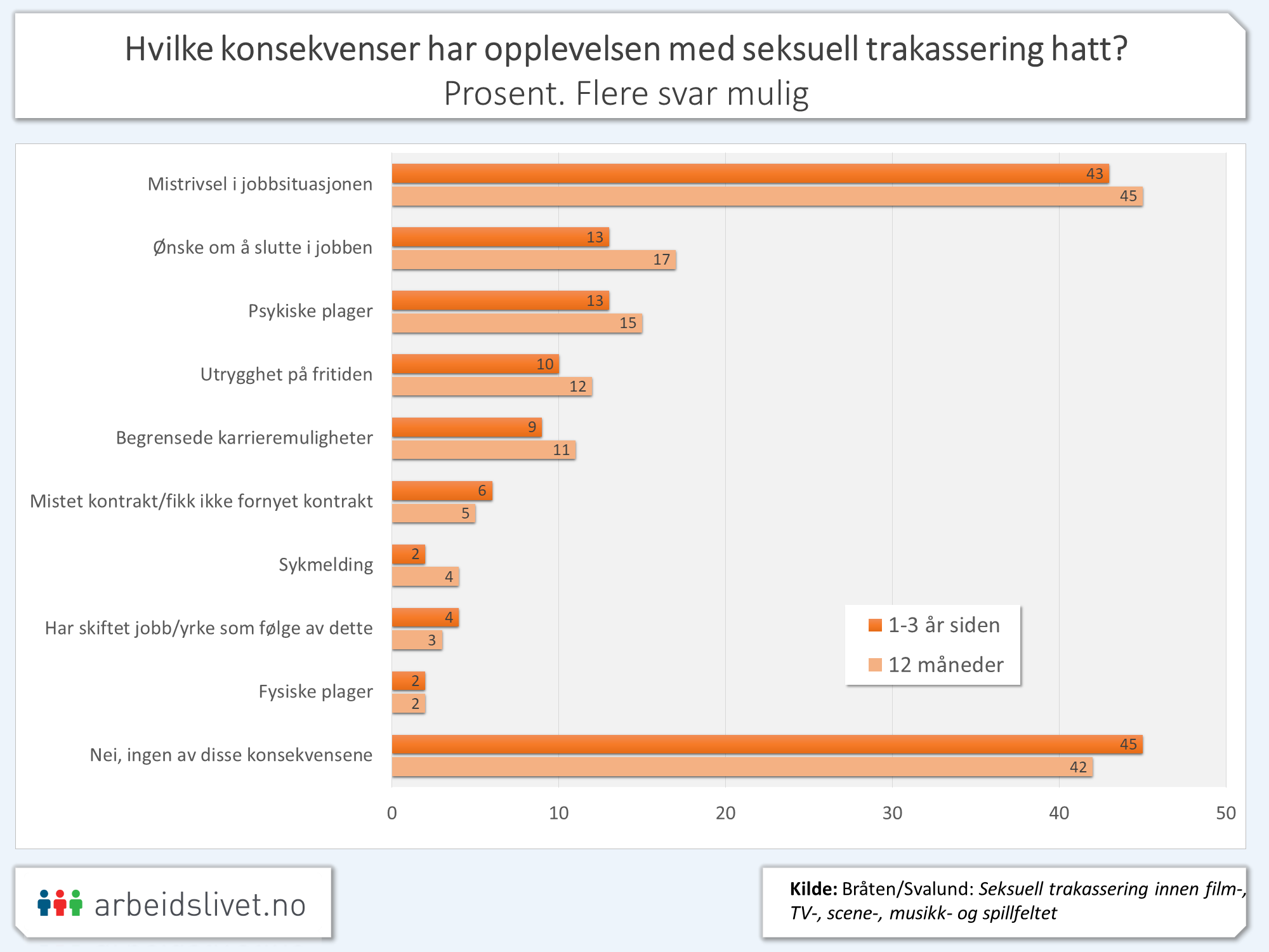 Noe under 60 prosent av dem som har opplevd seksuell trakassering i løpet av de siste tre årene oppgir at dette har ført til negative konsekvenser. Her er mistrivsel et nært garantert utfall, men mange viser også til mer alvorlige konsekvenser som psykiske plager, utrygghetsfølelse eller økonomiske eller andre karrieremessige etterspill.