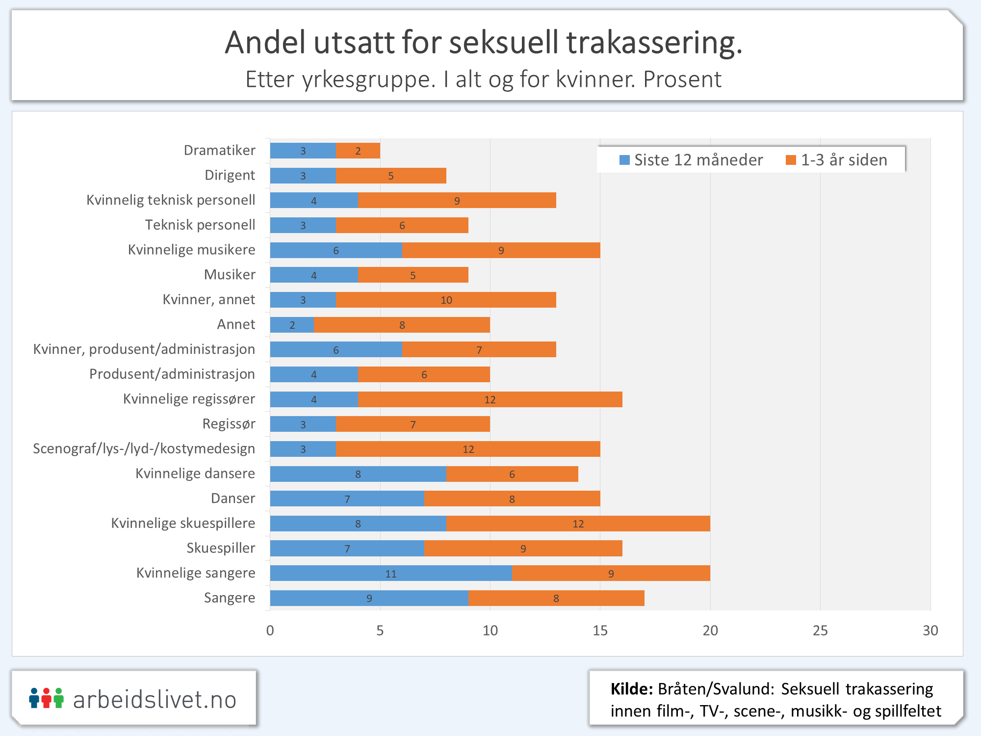 Dramatikerne har i minst grad (5 prosent) opplevd dette de siste tre år. Sangere er i motsatt ende av spekteret (17). Ser man kun på kvinnene i sistnevnte yrke, stiger tallet til 20 prosent – 1 av 5.