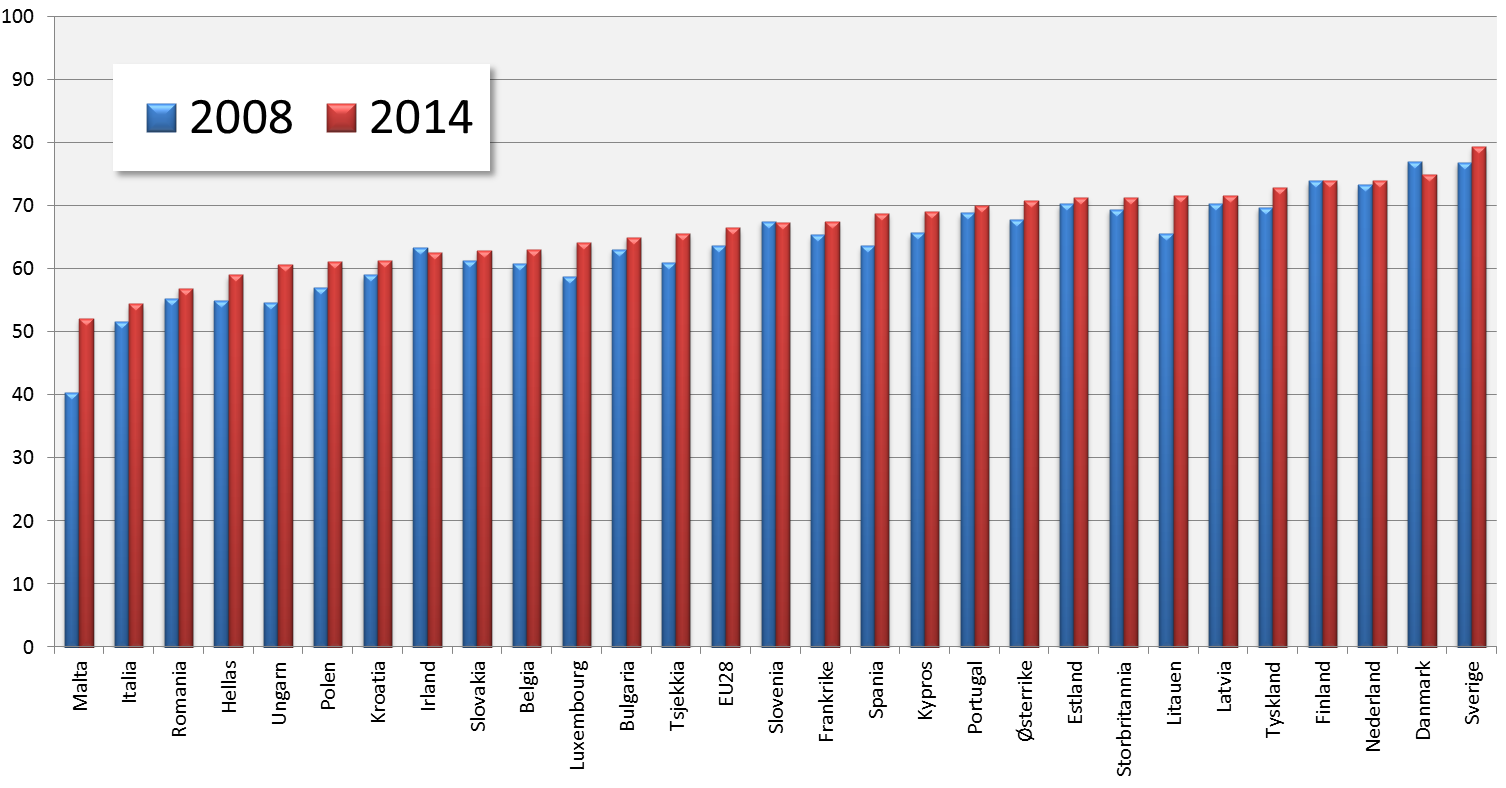 Like fullt har et land som Malta mer enn ti prosentpoengs økning i yrkesaktive kvinner – riktignok fremdeles til det laveste nivået i noe EU-land (fra 40 prosent i 2008 til 52 i 2014).