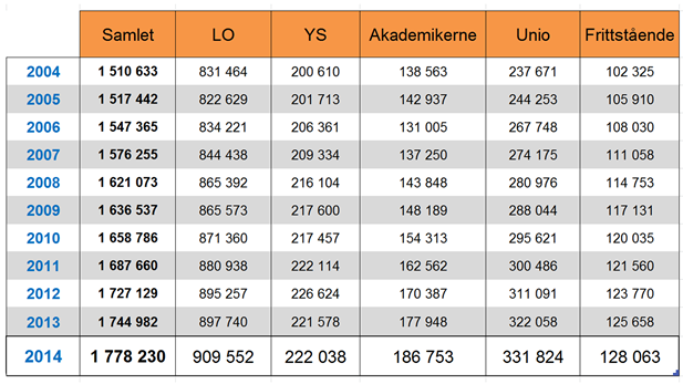 I rent antall innebærer dette at den samlede fagbevegelsen økte medlemsmassen med 33 000 medlemmer fra 2013 til 2014. Totalt var da 1 269 374 yrkesaktive lønnstakere fagorganiserte.