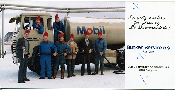 JULEKORT SOM SMURT: Vi har ikke funnet julekort med oljeplattform-motiv, men disse ålesundskara fra Bunker Service A/S kan få representere det norske oljeeventyret – med nisseluer. Ukjent år. Foto: Ukjent  / Digitalarkivet
