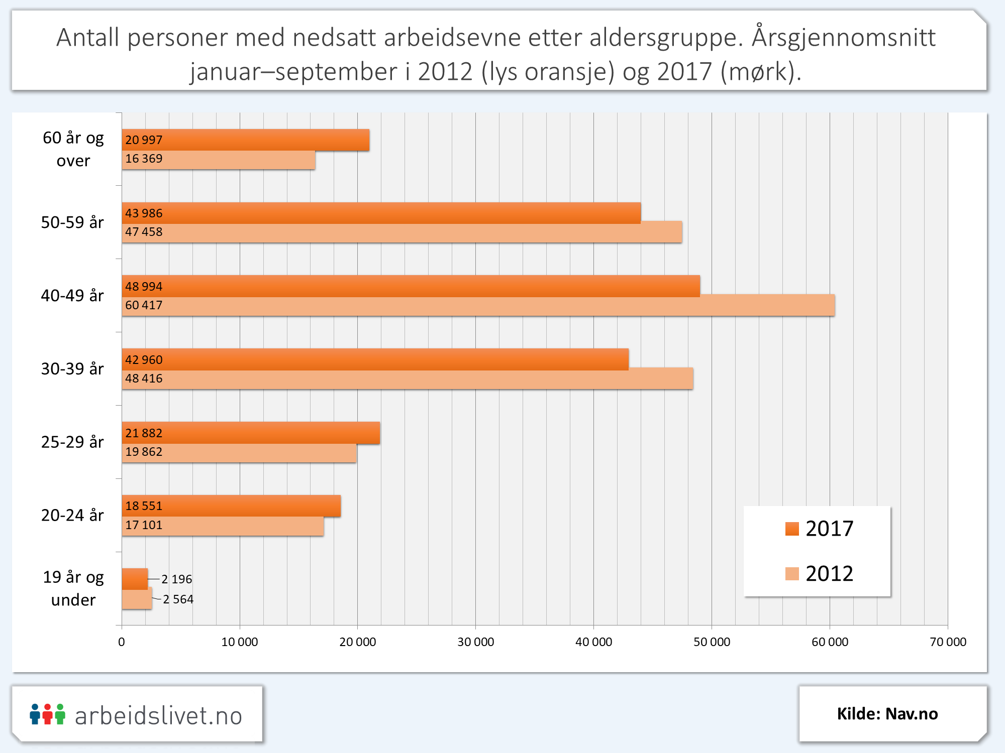 Til sammen 42 600 av arbeidsmarkedets yngste (yngre enn 30 år) var i snitt registrert med redusert arbeidsevne i 2017 (ultimo september).