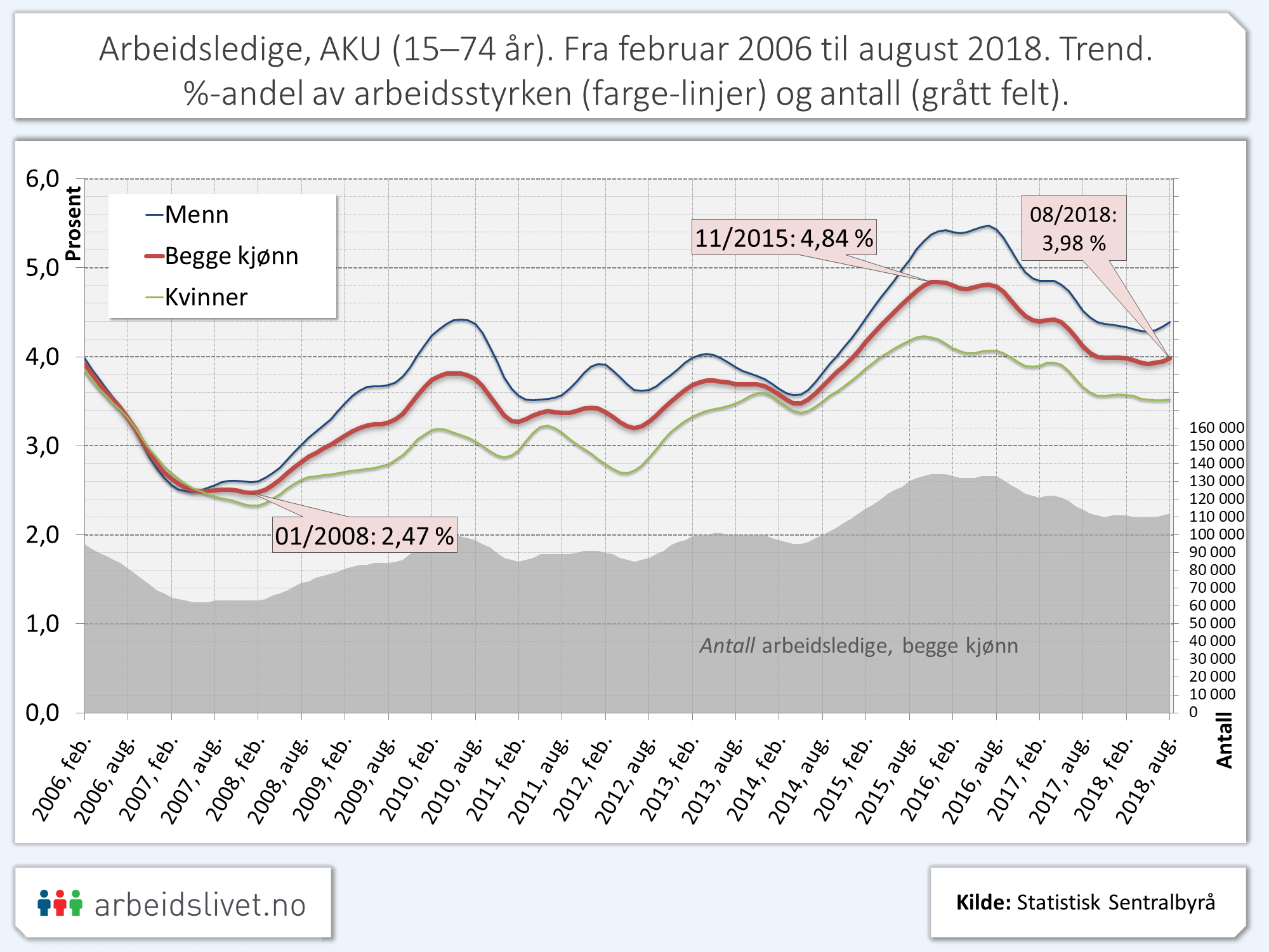 Fra 2006 fram til 2015 holdt arbeidsledigheten seg under 4 prosent av arbeidsstyrken, ifølge SSBs sesongjusterte AKU-tall. På nyåret 2008 var den helt nede i under 2,5 prosent.