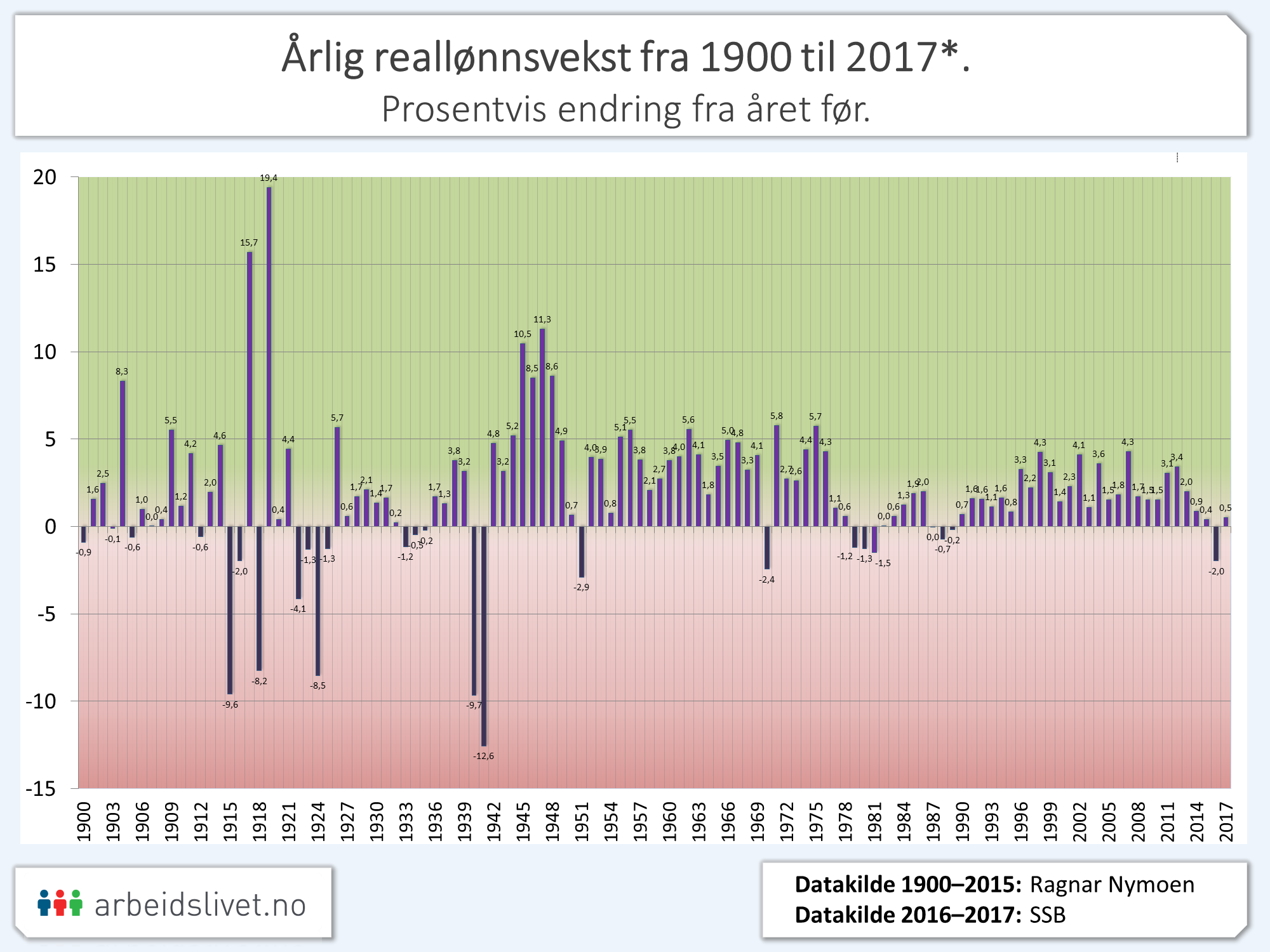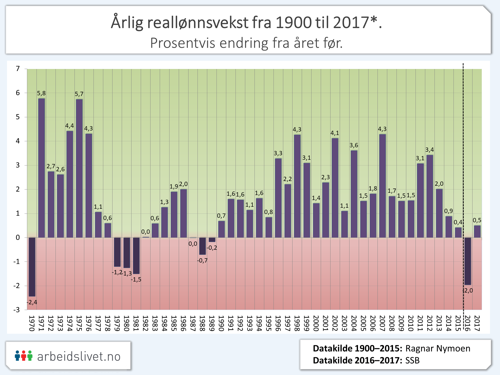 Ser vi på etterkrigstiden, var særlig 60- og 70-tallet preget av en relativt jevn vekst, etterfulgt av et urolig og «svakt» 80-tall. Fram 1990 til 2015 hadde gjennomsnittsnordmannen ikke opplevd et eneste år med reallønnsnedgang. Dette endret seg med oljekrise-året 2016. Også påfølgende år hadde svært liten reallønnsvekst.