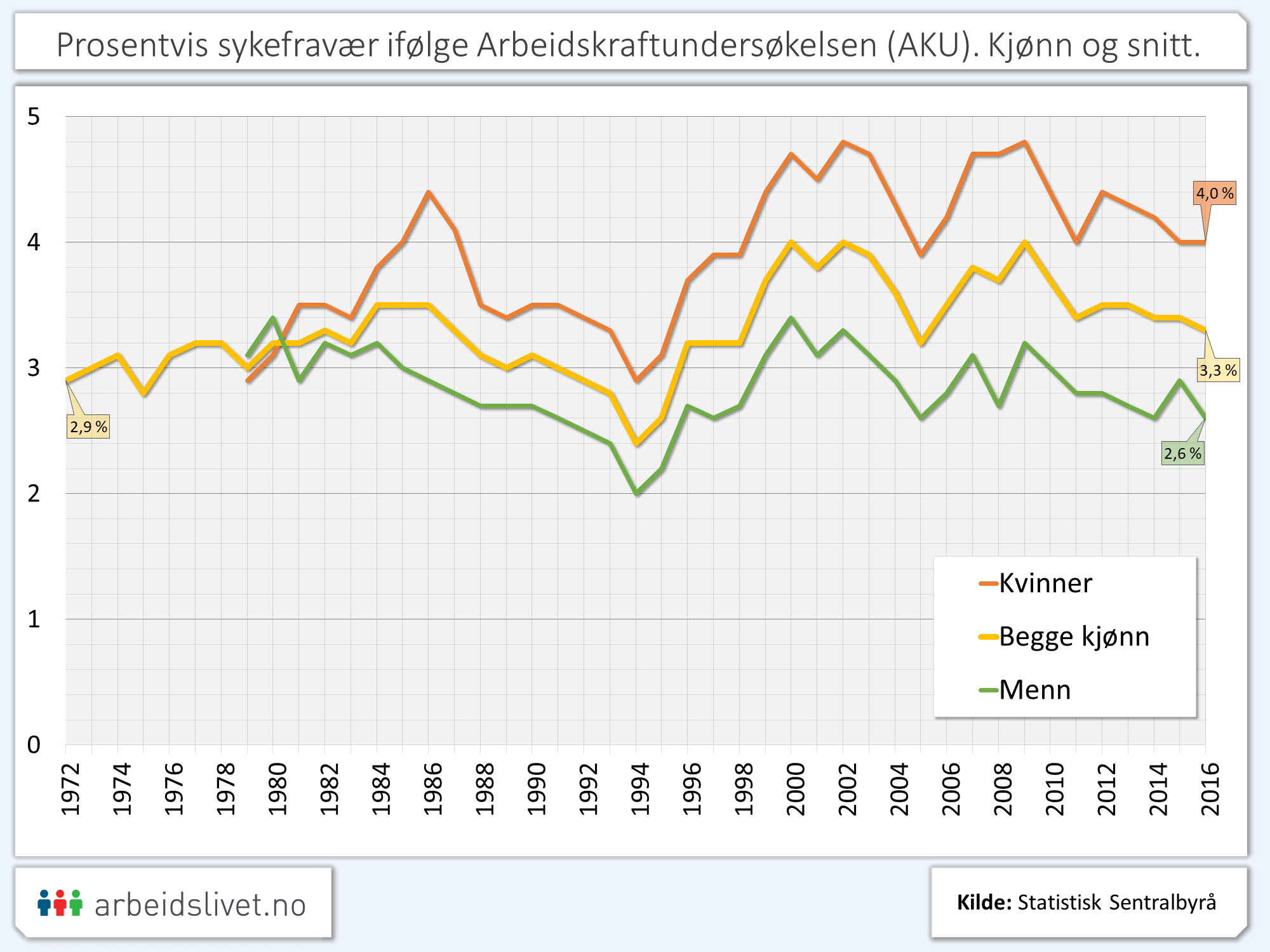 Forenklet sagt, men utgangspunkt i tallene nedenfor, kan man altså si at 3 av 100 arbeidstakere var syke på en gjennomsnittlig dag i 2016.