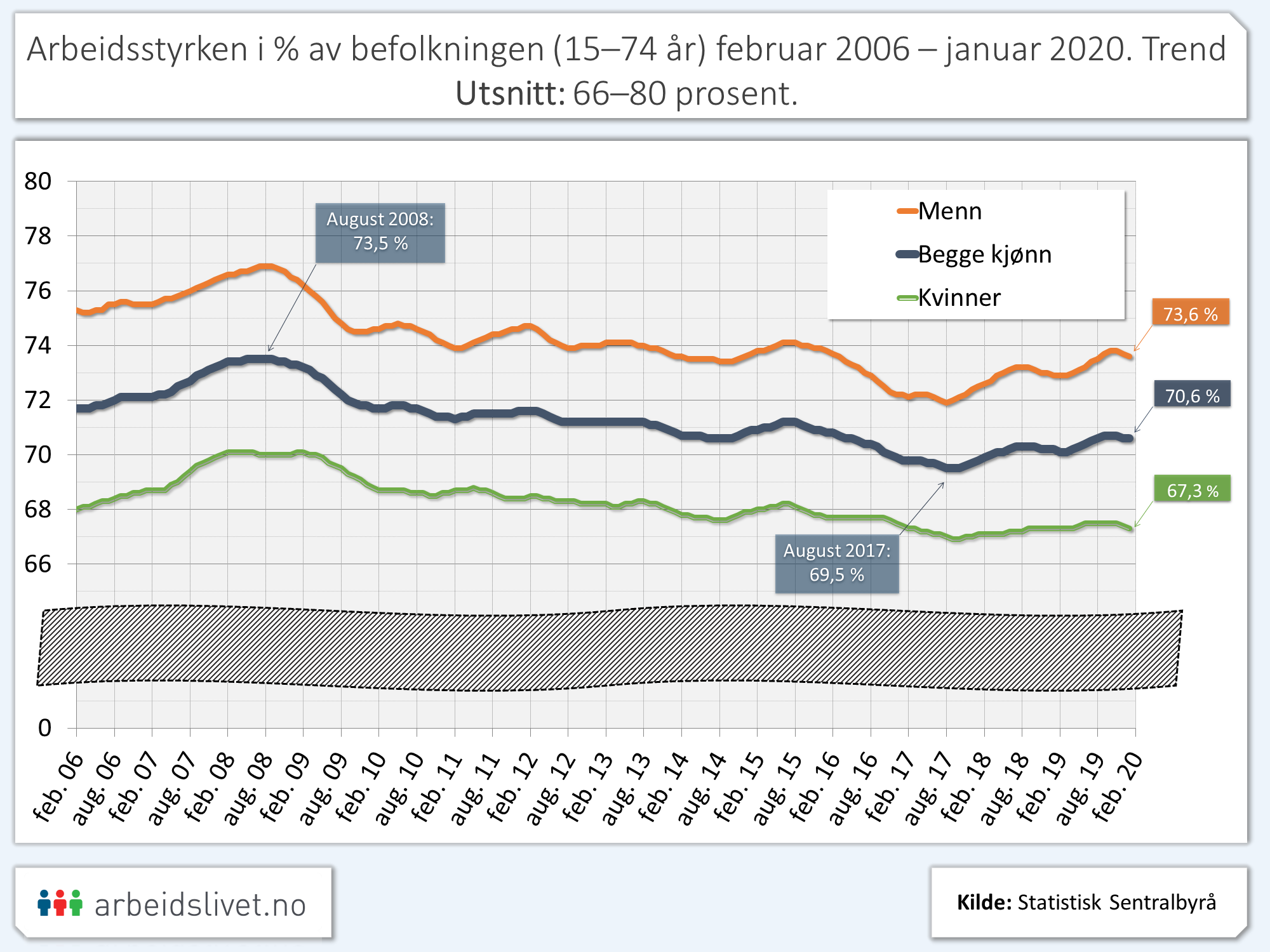 Juanuar 2020 ble 70,2 prosent av den norske befolkningen regnet for å være i arbeidsstyrken. Andelen er 3,6 prosentpoeng lavere enn for ti år siden, da den var i ferd med å klatre opp mot en topp på 74 prosent.