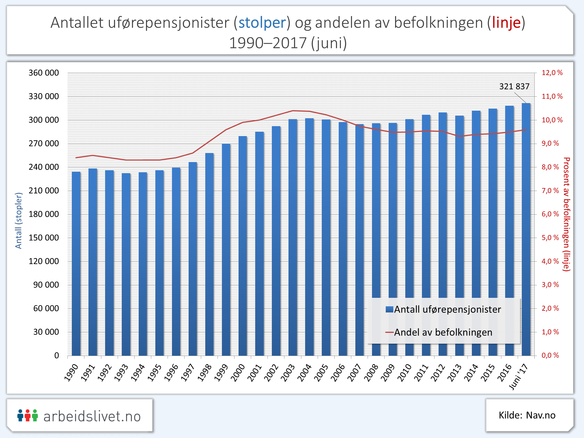 Per juni 2017 mottar 320 000 personer uføretrygd i Norge (blå søyler). Dette tallet har aldri vært høyere.