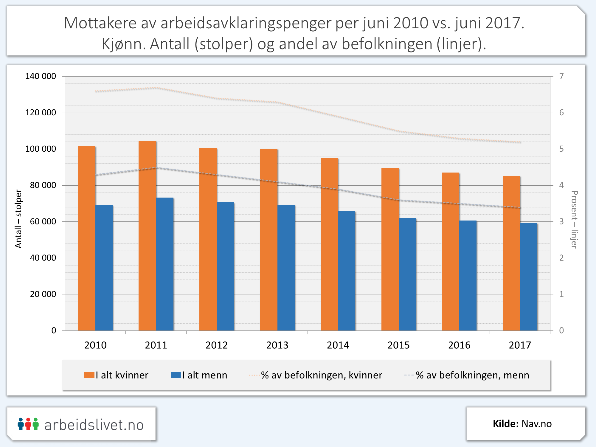 I august 2017 mottok 143 000 personer arbeidsavklaringspenger. Antallet har vært synkende siden en topp i 2011, da ordningen var fersk.