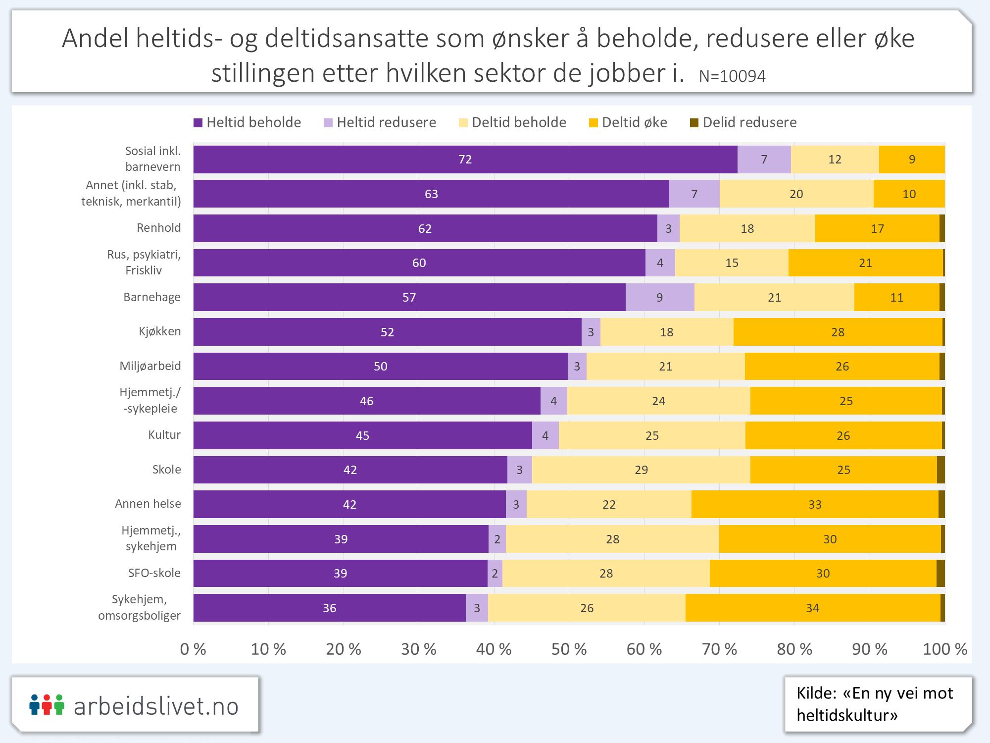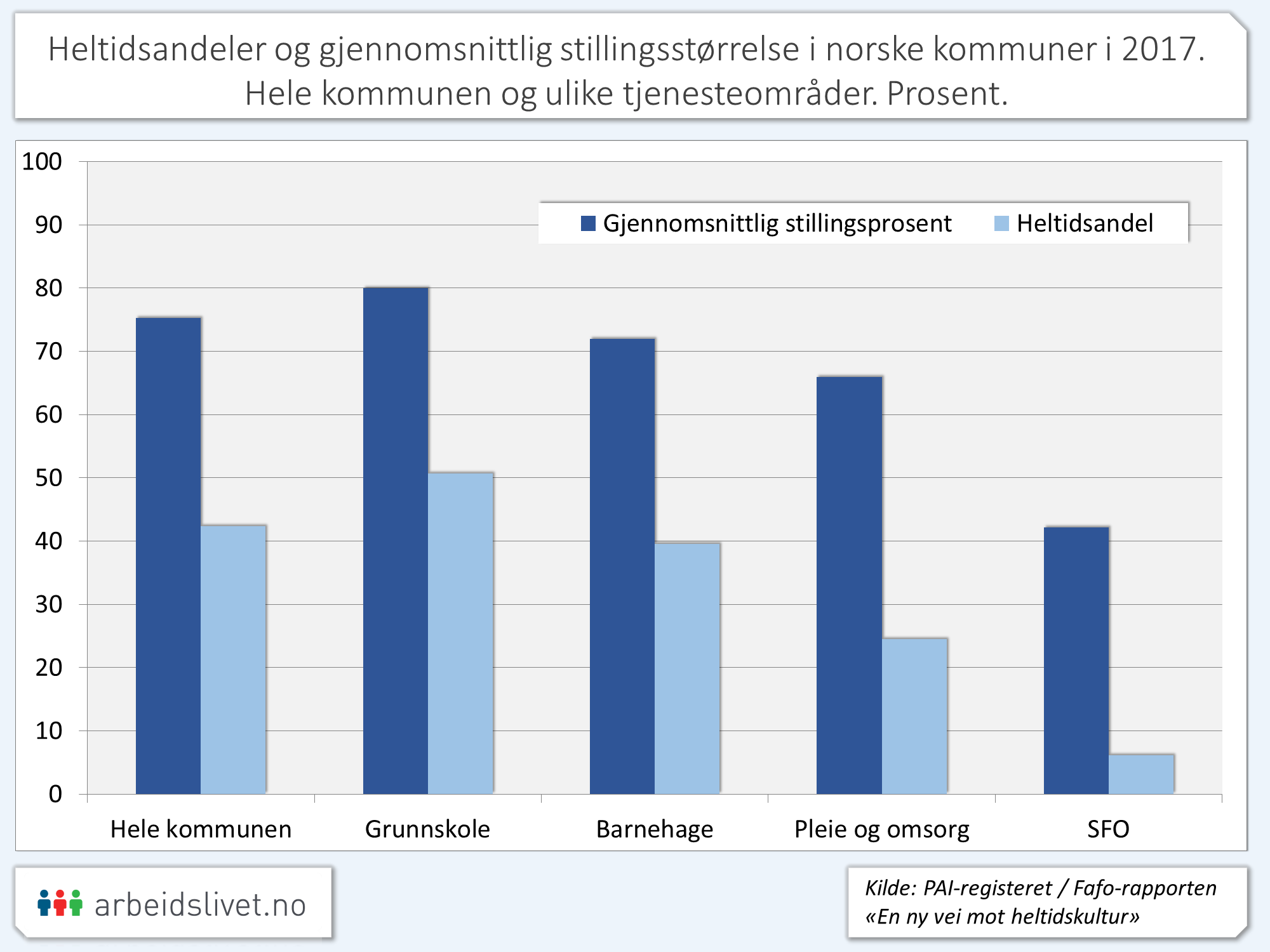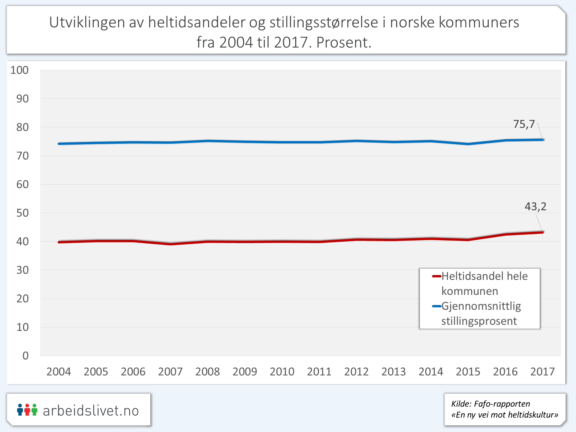 Fra 2002 til 2016 lå andelen heltidsansatte i den kommunale pleie- og omsorgssektoren stabilt på rundt 23–24 prosent, ifølge data fra PAI-registeret. De siste to årene har heltidsandelen økt til 26 prosent.