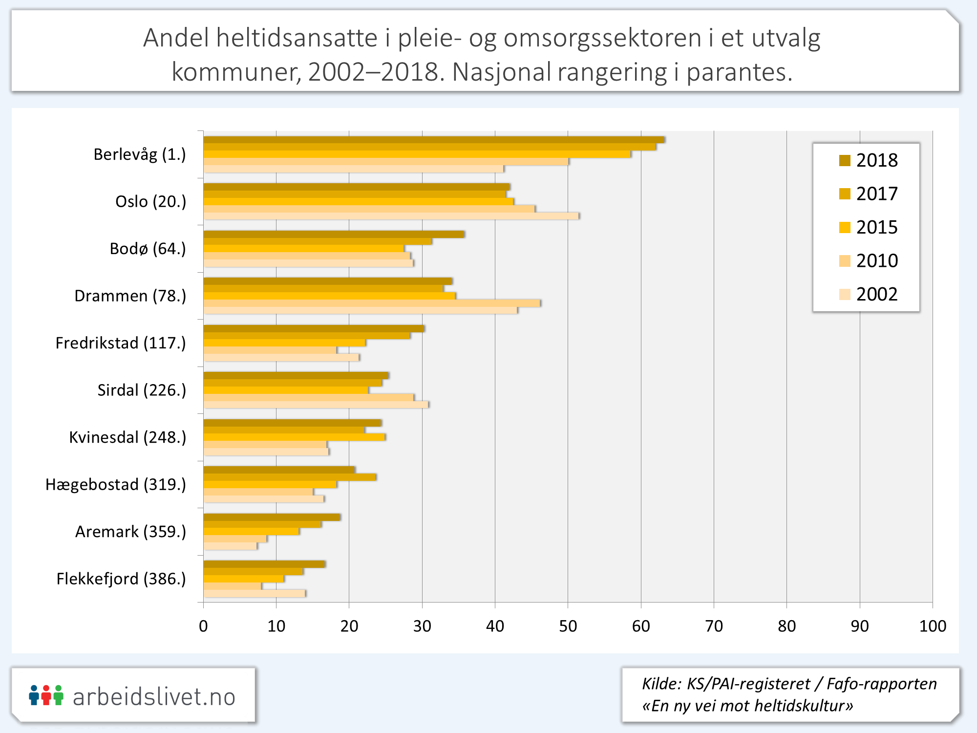 Det er også store forskjeller mellom de enkelte kommunene innen pleie og omsorg. Landets «beste» kommune er Berlevåg som siden 2002 har løftet heltidsandelen fra rundt 40 til over 60 prosent.