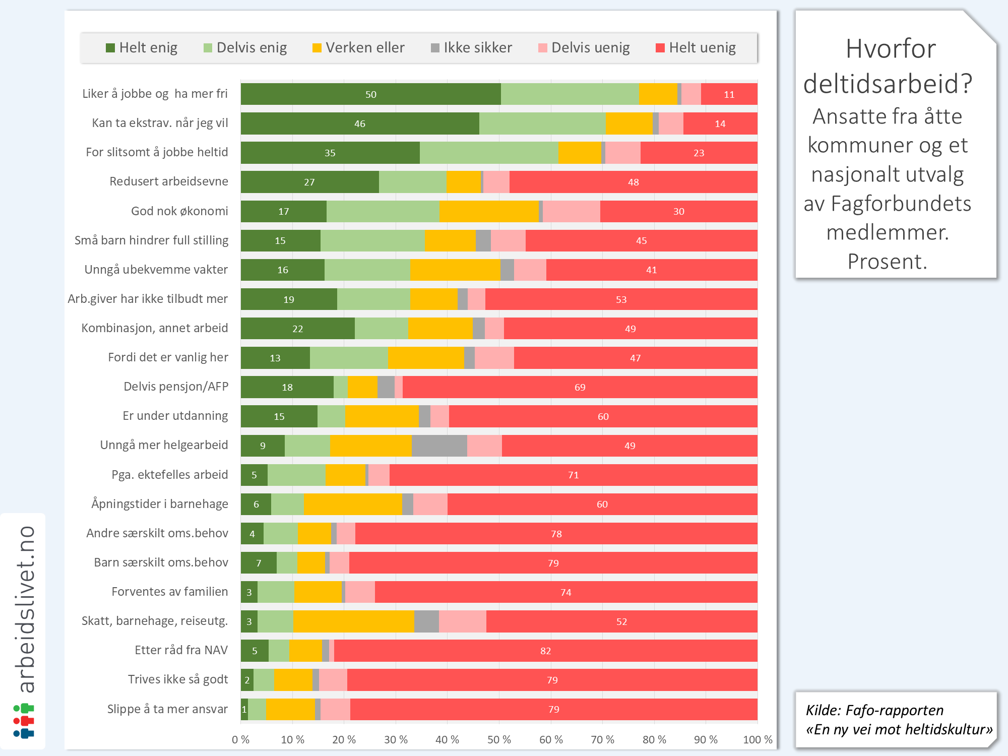 I Fafo-rapporten kommer det fram at ønsket om fritid – selv om de liker å jobbe – er det vanligste, men mange oppgir også at det er «for slitsomt å jobbe heltid».