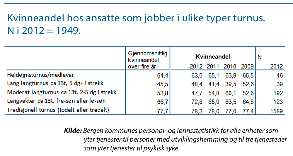 | UTVIKLINGEN i kvinneandelen blant ansatte som jobber i ulike typer turnus, 2009–2012. (klikk for full størrelse) |
