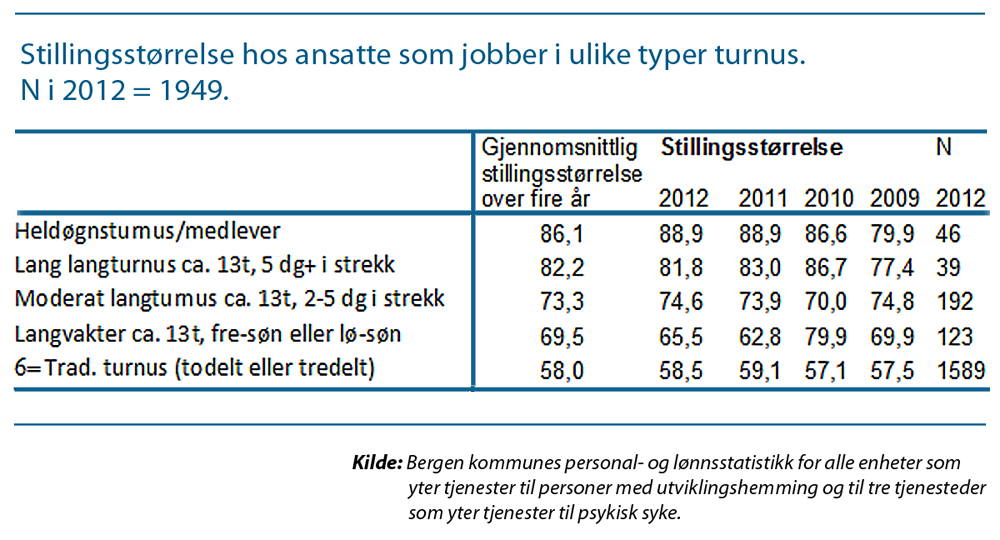 Avsluttende funn og betraktninger blitt samlet i rapporten Langturnus og hele stillinger i Bergen kommune – arbeidstid i tjenester for utviklingshemmede og psykisk syke.