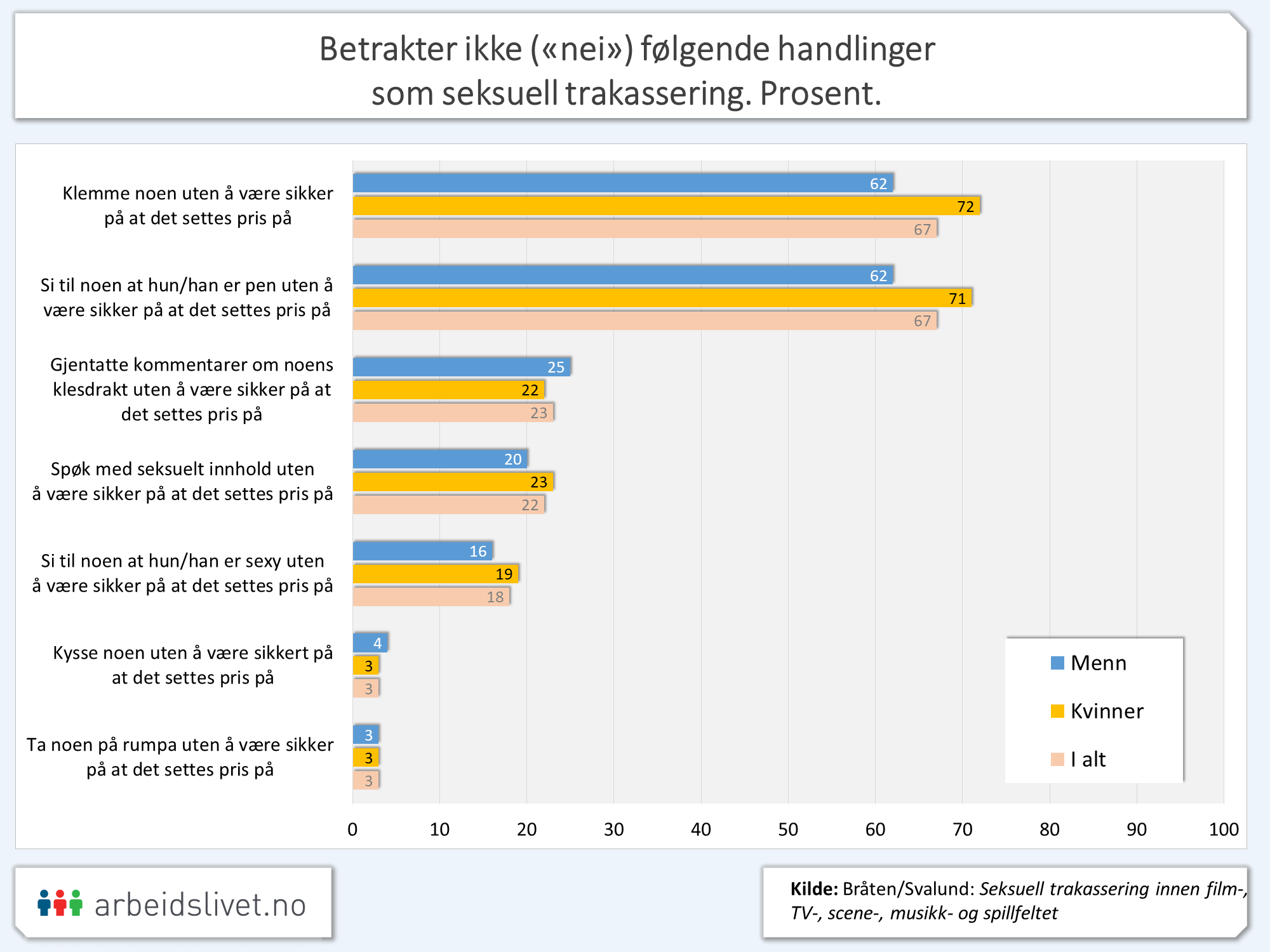 Om vi likevel ser på forskjellene som finnes, slås det muligens sprekker i enkeltes fordommer om «overfølsomme kvinnfolk». Det er for eksempel flere kvinner enn menn som mener at det ikke kan forstås som seksuell trakassering «å klemme noen uten å være sikker på at det settes pris på» eller «å si til noen at hun/han er pen uten å være sikker på at det settes pris på».