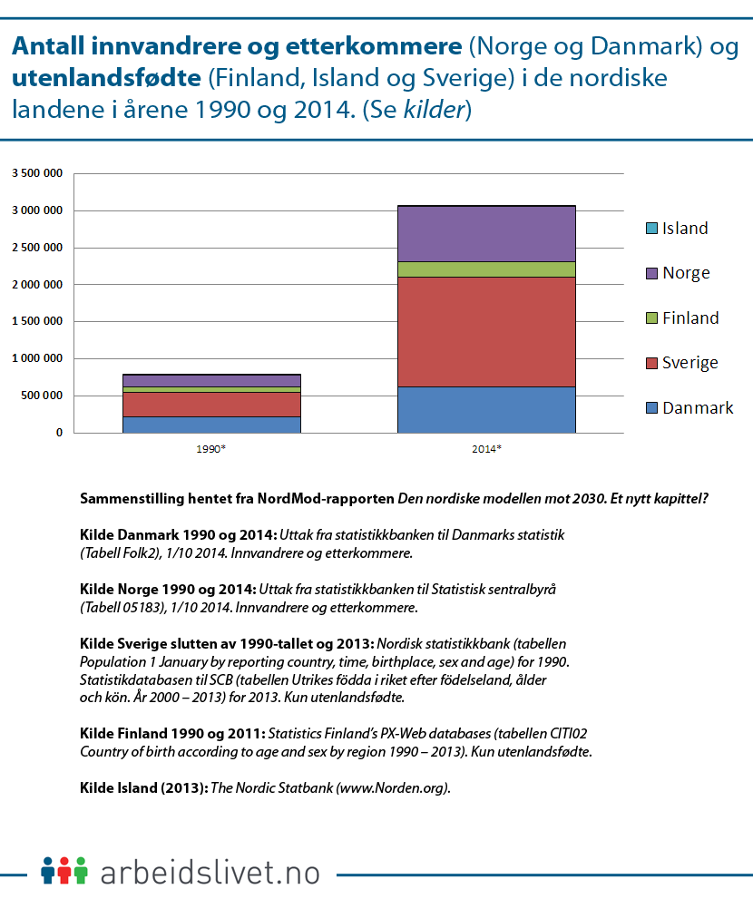 ANTALL INNVANDRERE og etterkommere (Norge og Danmark) og utenlandsfødte (Finland, Island og Sverige) i de nordiske landene i årene 1990 og 2014, som presentert i NordMods sluttrapport (klikk for full størrelse og kilder)