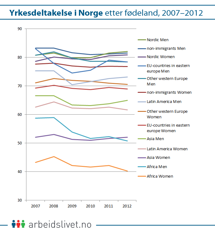 Gruppene med lavest yrkesdeltakelse er menn og kvinner fra Asia (rundt 65 og 52 prosent i 2012) og Afrika (i overkant av 50 og 40 prosent).
