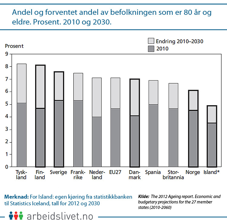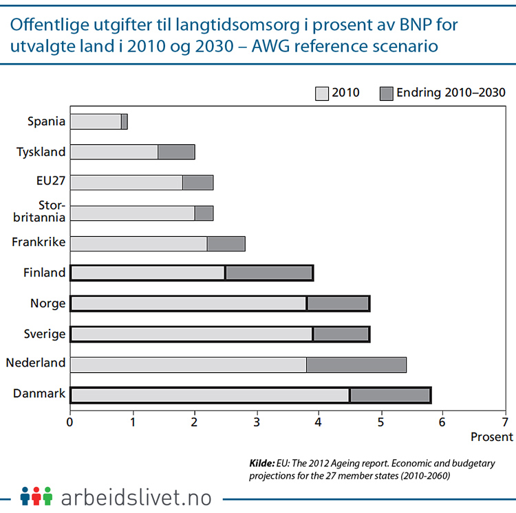 Eldreomsorg og pensjonsutgifter ligger an til å kreve mer plass i de nordiske landenes statsbudsjetter. For EU-gjennomsnittet forventer man at prisen for langtidsomsorg vil øke med 0,5 prosentpoeng av bruttonasjonalprodukt (BNP) fram mot 2030.