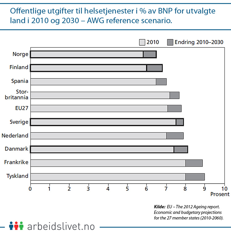 Legger man sammen den forventede utgiftsveksten til pensjoner, langtids omsorg og helse, er det særlig Norge og Finland som får en markert økning i utgifter til disse formålene.