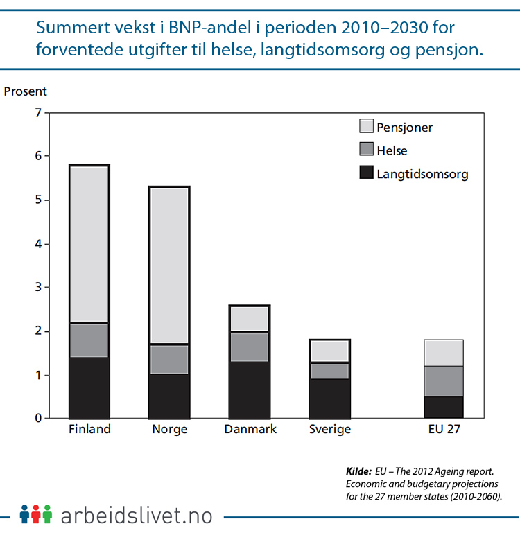 I tillegg vil pensjonsutgiftene øke. For Finland og Norge vil dette spranget bli på 3,6 prosentpoeng av BNP. For Sverige og Danmarks del er denne veksten langt mindre, rundt 0,5 prosentpoeng.