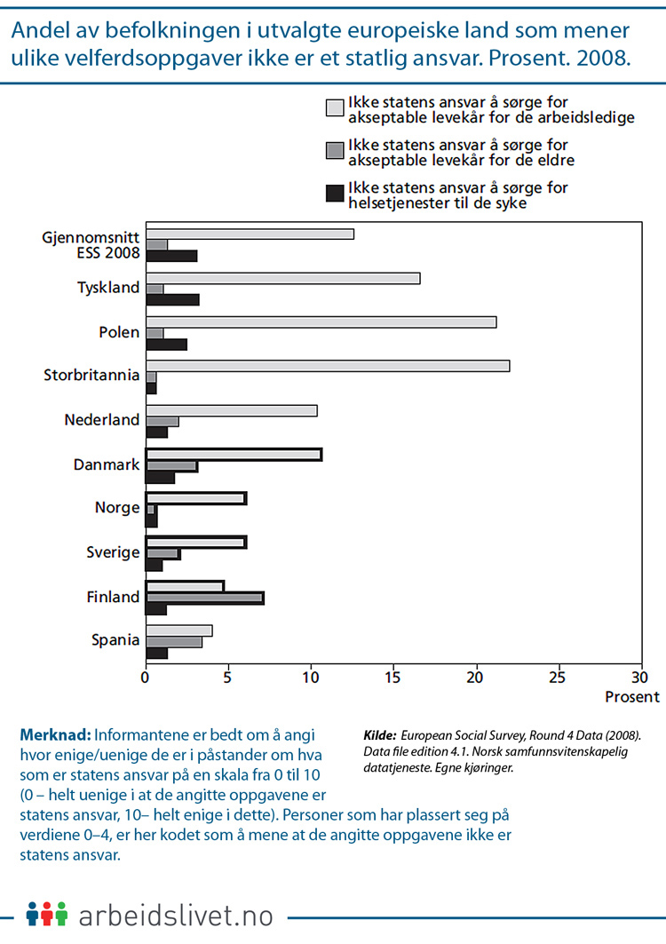 Jevnt over mener et overveldende flertall av alle disse landenes befolkninger at staten har et ansvar for å sørge for akseptable levekår for eldre og helsetjenester ved sykdom. Et lignende ansvar overfor arbeidsledige har noe mindre støtte, i hvert fall i enkelte land hvor mellom en fjerde- og femtedel mener dette ikke er statens ansvar.