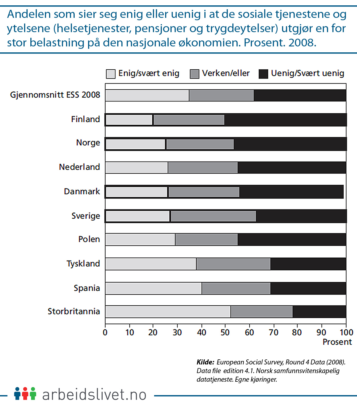 Et betydelig mindretall er bekymret for at sosiale tjenester og ytelser utgjør en for stor belastning på den nasjonale økonomien. I de nordiske landene (med unntak av Island, som ikke figurerer på lista) svarer et sted mellom 20 og 30 prosent bekreftende til en slik uro.