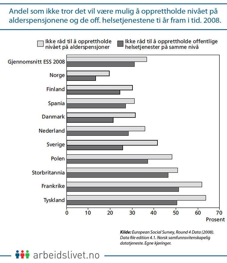 Andel som tror at det ikke vil være mulig å opprettholde nivået på alderspensjonene og de offentlige helsetjenestene ti år fram i tid. 2008.