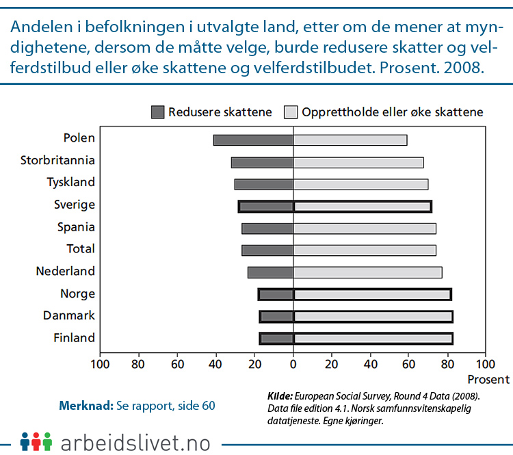Med et delvis unntak av Sverige, er også skattevilligheten høyest og ønsket om redusering av skattene lavest i de nordiske landene.