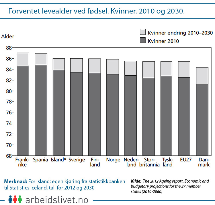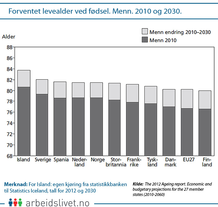 Allerede i dag er de forventede levealdrene i de nordiske landene relativt høye, men spriker noe. Finland og Danmark ligger under EU-gjennomsnittet for henholdsvis menn og kvinner. Når det gjelder menns forventede levealder ligger Island helt på topp.