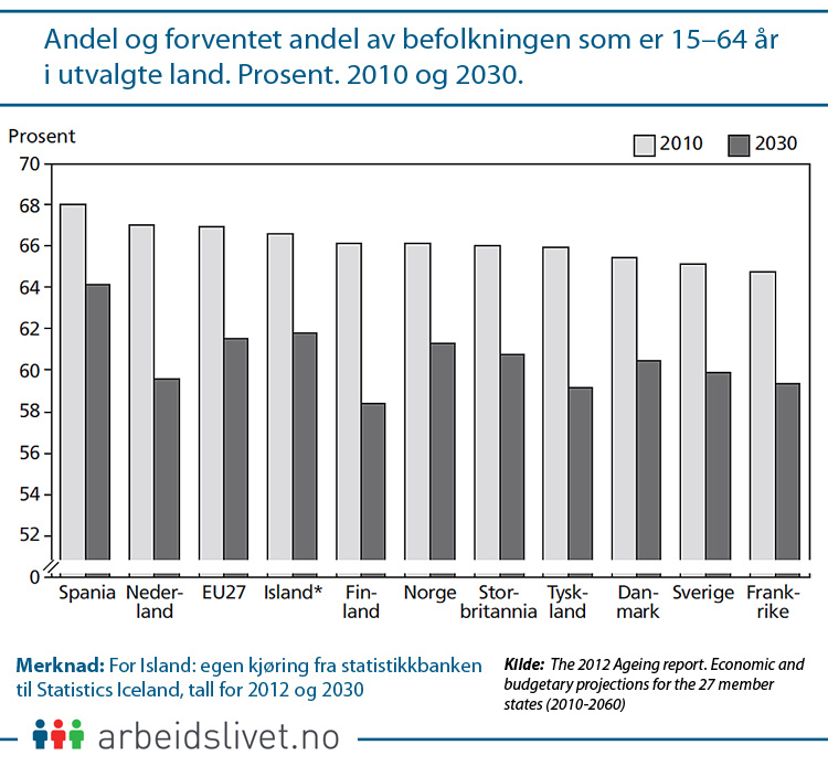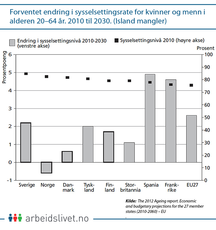 Man antar riktignok at andelen sysselsatte vil øke svakt i alle nordiske land med unntak av Norge. Blant personer i yrkesaktiv alder vil andelen sysselsatte her kunne synke med 0,6 prosentpoeng.