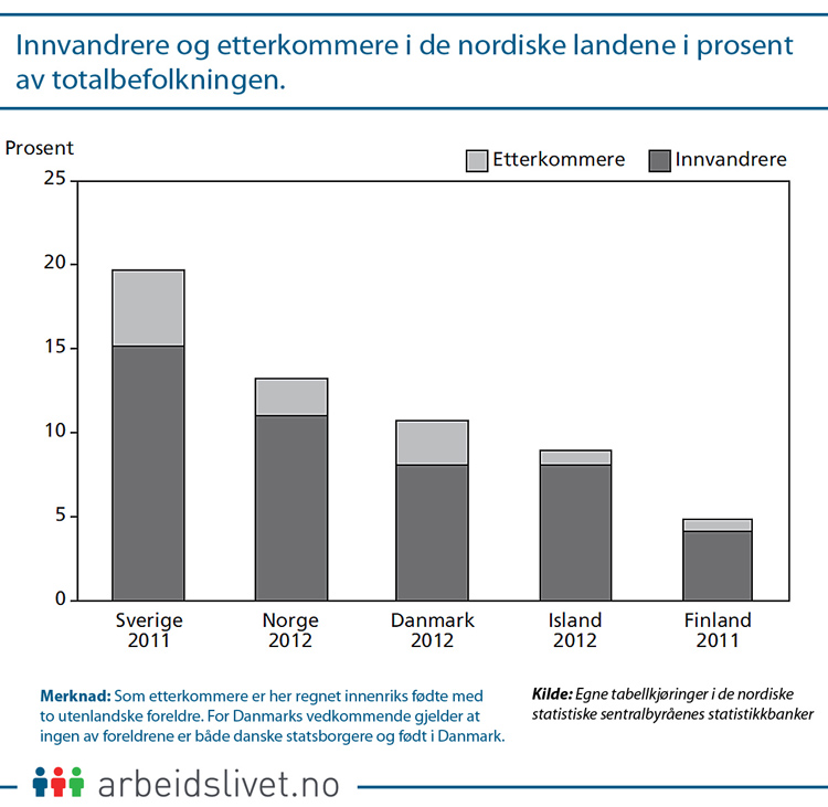 Per i dag er andelen innvandrere størst i Sverige (ca. 20 prosent om man regner med etterkommere) og lavest i Finland (ca. 5 prosent).