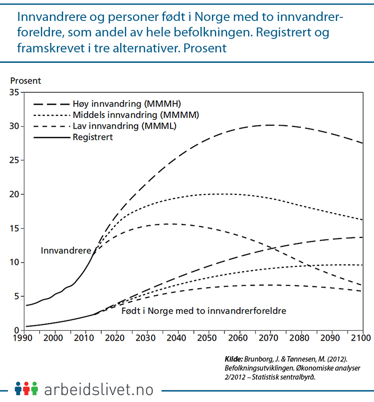 I Norge er både første- og andregenerasjons innvandrere anslått å øke fra 15 til 23 prosent i samme periode, og i Danmark fra 10 til 14 prosent.