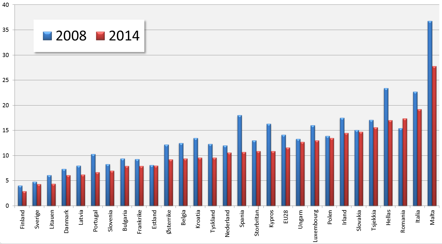 Like fullt har et land som Malta mer enn ti prosentpoengs økning i yrkesaktive kvinner – riktignok fremdeles til det laveste nivået i noe EU-land (fra 40 prosent i 2008 til 52 i 2014).