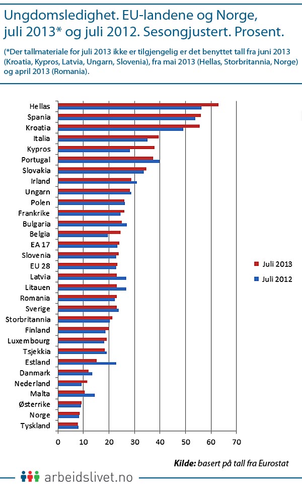 UNGDOMSLEDIGHET. EU-landene og Norge, juli 2013* og juli 2012. Sesongjustert. (klikk for full størrelse)