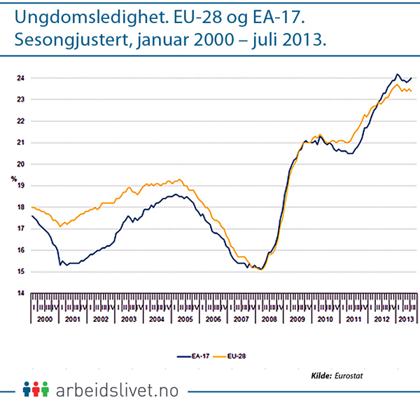 UNGDOMSLEDIGHET. EU-28 og EA-17. Sesongjustert, januar 2000 – juli 2013. (klikk for full størrelse)