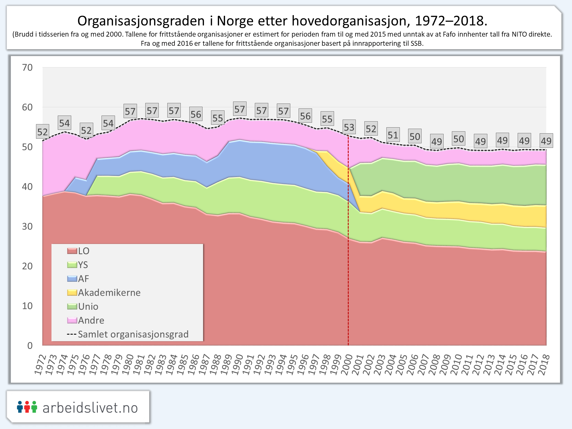 Organisasjonsgraden blant arbeidstakere etter hovedorganisasjon, 1972–2018.* Brudd i tidsserien fra og med 2000, da ny beregningsmetode ble innført.