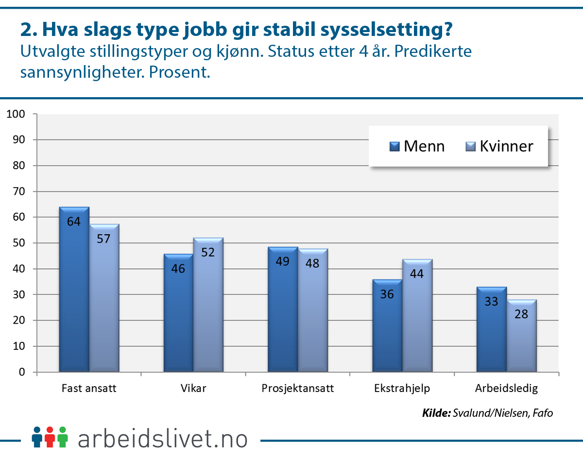 Jo eldre man er, jo bedre sjanse til å være i stabil sysselsetting. Men unge på midlertidige kontrakter er likevel ikke så mye dårligere stilt enn eldre arbeidstakere i samme situasjon. Typen midlertidig jobb – vikar, ekstrahjelp eller lignende – gir et større utslag enn alder.