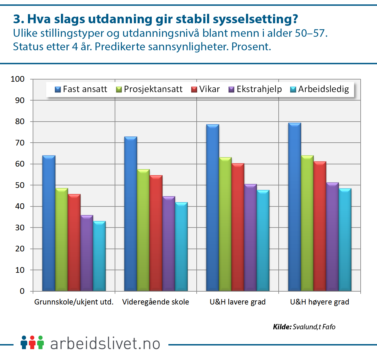 60 prosent av midlertidige ansatte har kun grunnskole (20 prosent) eller videregående (40 prosent). Dette er færre enn fast ansatte (67 prosent), men mer enn arbeidsledige (81 prosent).