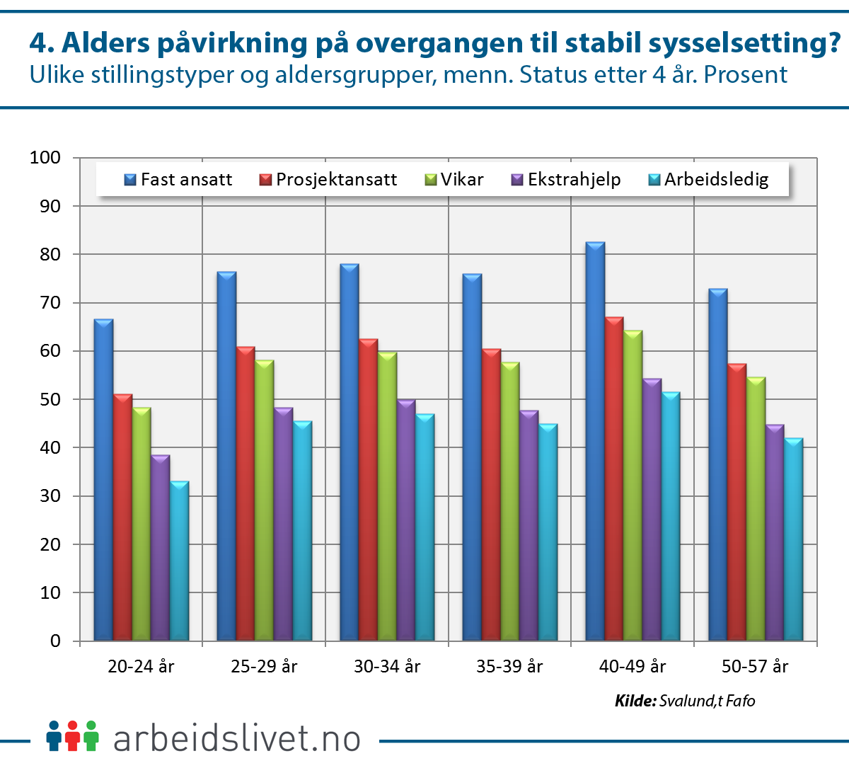 Sammenligner man personer i førtiårene (40–49 år) og tjueårene (20–29 år) vil for eksempel 66 prosent av «eldre» vikarer og 62 prosent av «unge» være stabilt sysselsatt fire år senere.