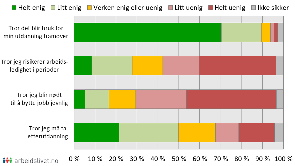Generelt har ungdommen sterk tro på at det er plass til dem på framtidens arbeidsmarkedet . Arbeidsledighet og hyppige jobbytter er det kun et mindretall som anser som sannsynlig for dem.