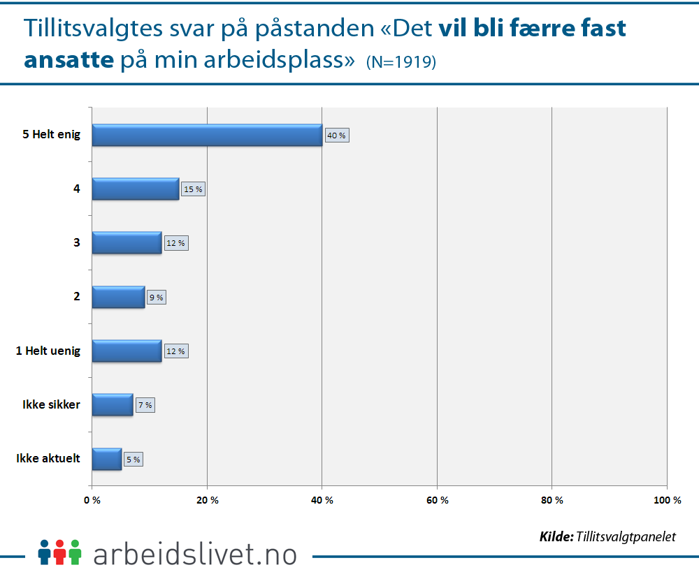 Blant de tillitsvalgte ute på arbeidsplassene er det bekymring for konsekvensene. Mer enn halvparten mener at en slik endring vil føre til større gjennomtrekk på arbeidsplassen, færre fast ansatte og dårligere arbeidsmiljø.