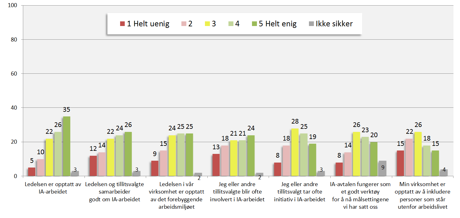 Det kan virke som om stemningen er litt lunken. Det er bare 26 prosent som er helt enige i en påstand om at ledelsen og tillitsvalgte samarbeider godt om IA-arbeidet. 24 prosent er delvis enige, så til sammen er det halvparten som svarer at samarbeidet fungerer.