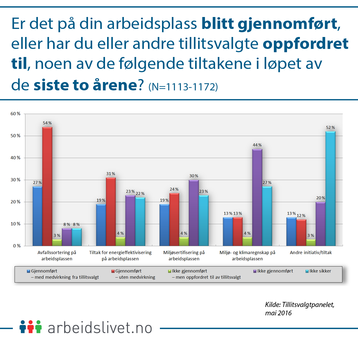 Avfallssortering er det vanligste tiltaket, og er gjennomført ved 81 prosent av arbeidsplassene. Tiltak for energieffektivisering og miljøsertifiseringer er også rimelig utbredt, gjennomført ved henholdsvis 50 prosent og 43 prosent av arbeidsplassene. Miljø- og klimaregnskap er mindre utbredt (26 prosent), men gjøres oftere med medvirkning fra tillitsvalgte.