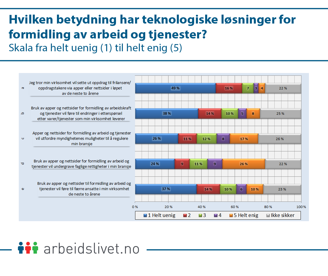 Samtidig er det 16 prosent som tror at formidling av arbeid og tjenester via apper og nettsider vil føre til færre ansatte i virksomheten de neste to årene.