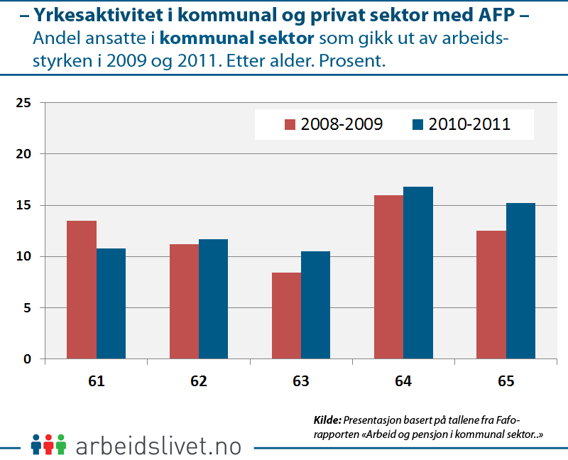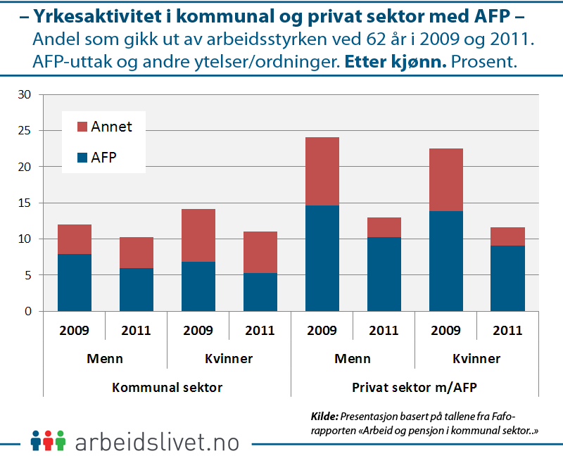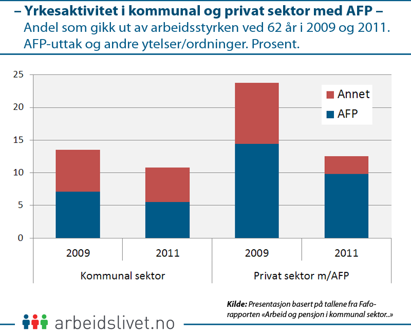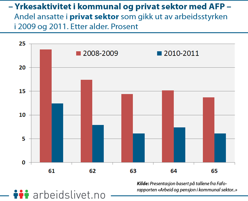 – I privat sektor så vi fra 2009 til 2011 nesten en halvering i bruken av AFP, fra rundt 24 til 12 prosent. I kommunal sektor falt andelen i samme periode med rundt en tredjedel, til i underkant av 10 prosent av ansatte som ennå var i jobb, oppsummerer Nielsen.